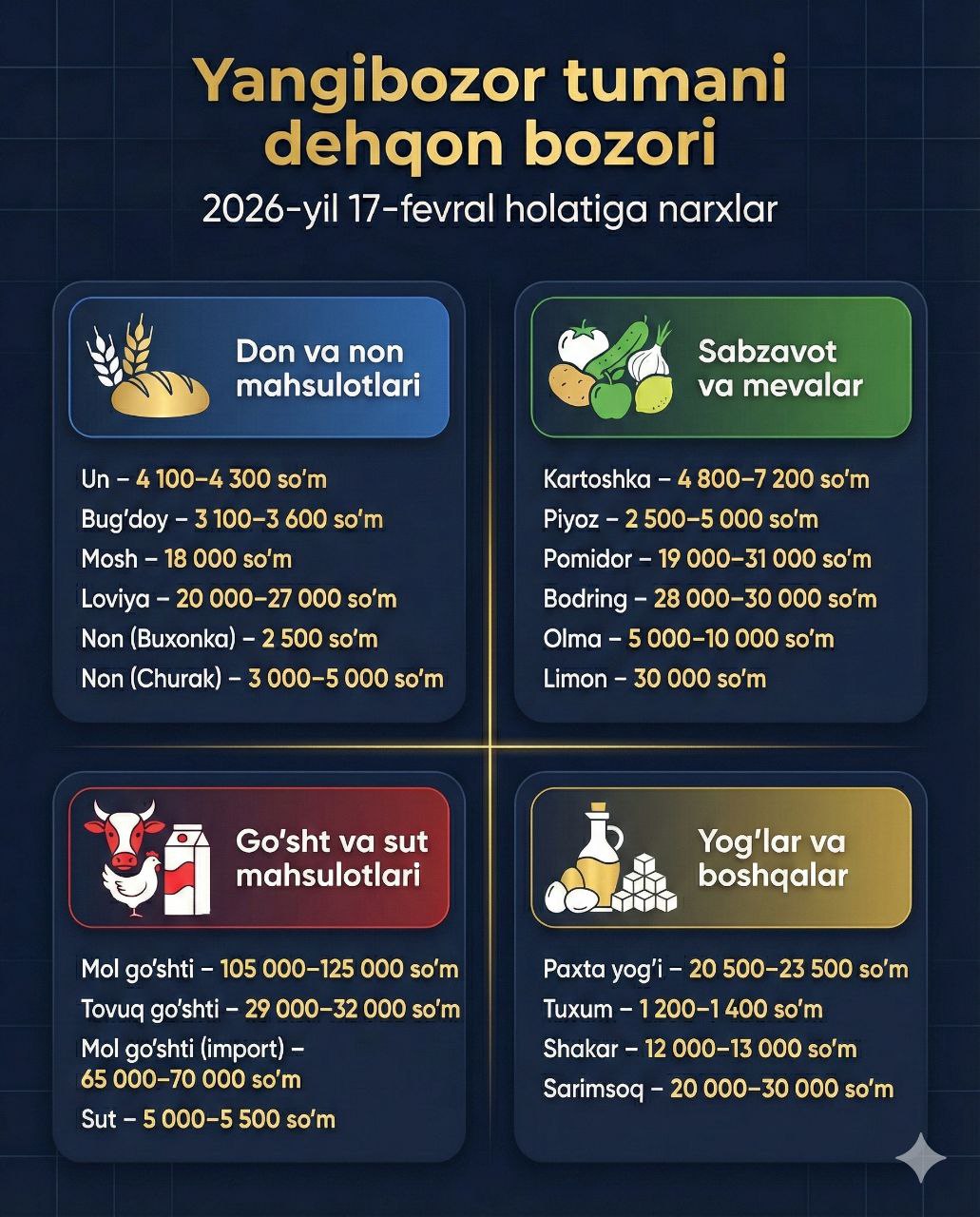 2026-yil 17-fevral holatiga “Yangibozor dehqon bozori” AJda sotilayotgan asosiy turdagi qishloq xo‘jaligi mahsulotlarining amaldagi baholari bilan tanishing.